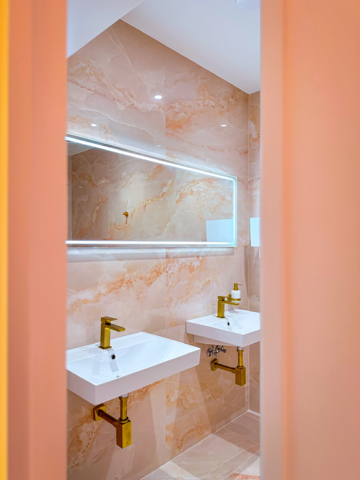 Žádný chaos, žádný machrování. Jen čistý prostor, vůně, světlo, hudba, která neruší. Všechno jsme dělali a děláme poctivě do posledního detailu – i růžovo onyxové sprchy.